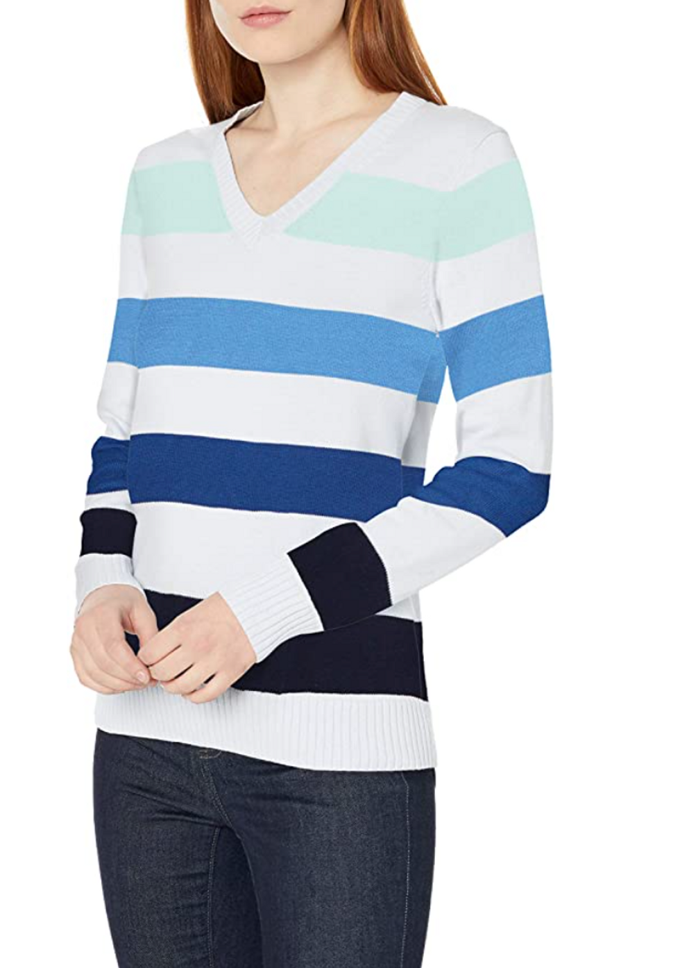 Have stripes ever gone out of style? I don’t think so — which means you’ll get a ton of wear out of this sweater. Not only will it be in style through multiple seasons, but the defined ribbing at the neckline, cuffs, and hem make it look way more expensive than $25.