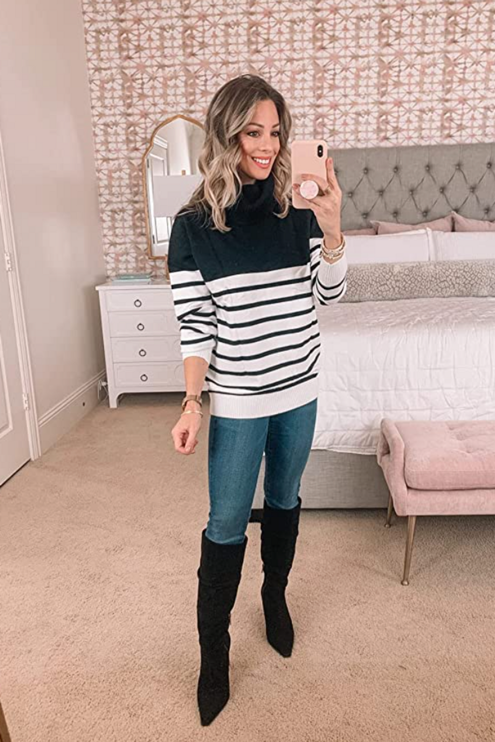 It doesn’t matter whether you’re in the mood to wear jeans or a skirt — this striped turtleneck will look good with either, as well as everything in-between. It’s made from a soft polyester-cotton blend, with a chunky, knit quality to it for a little extra comfort. Plus, it even comes in dozens of other colors.