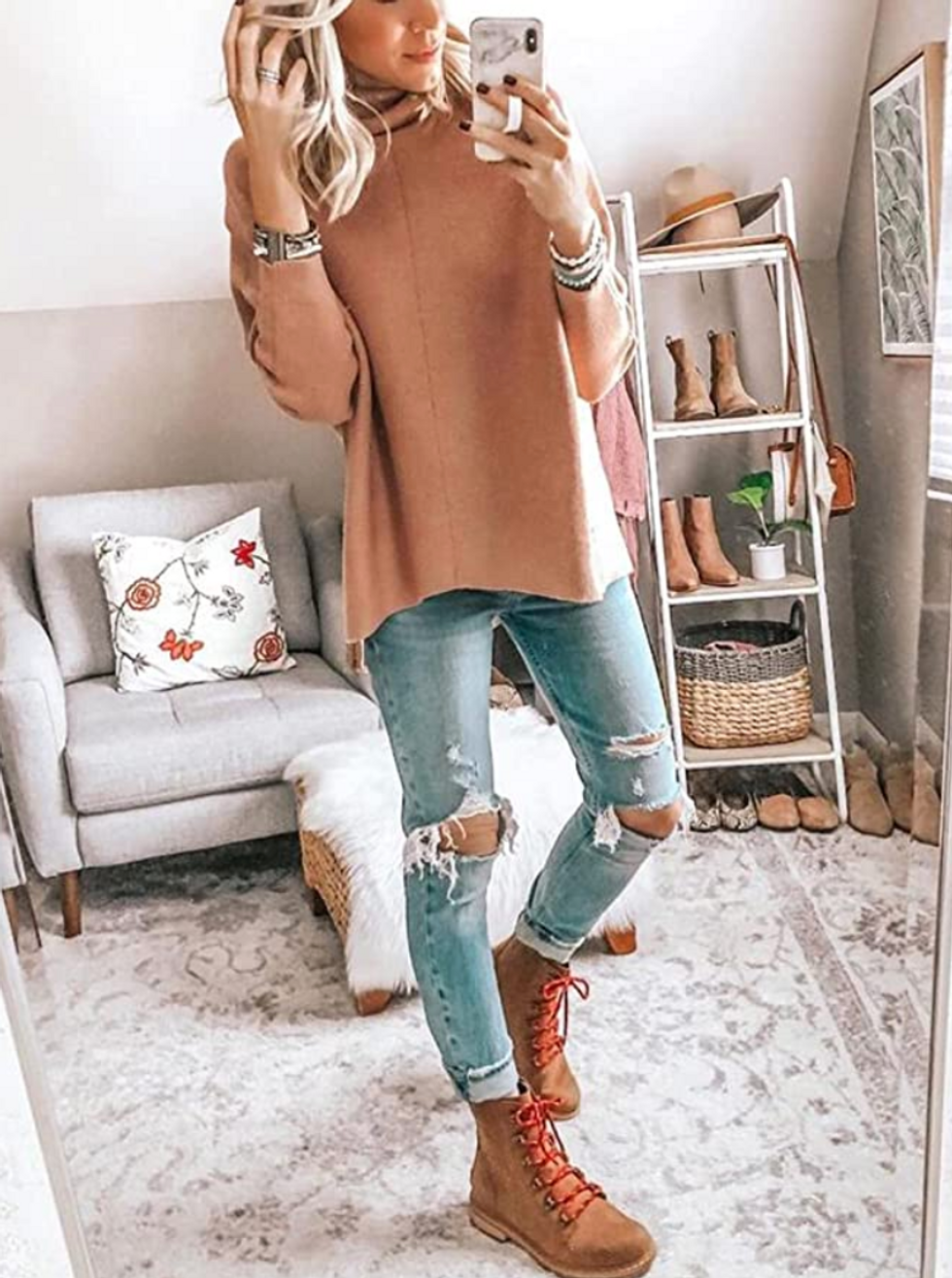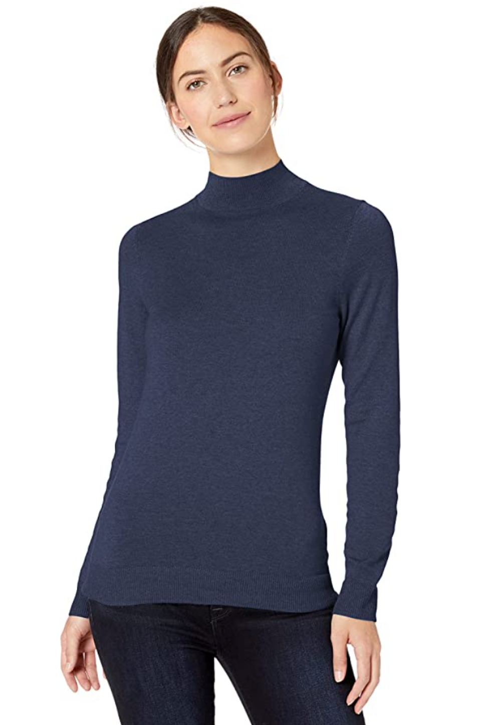 You know how some sweaters can cling to your body, leaving you sweaty and uncomfortable? That isn’t the case with this one. The cotton-modal blend has a close-but-comfortable fit to it, giving you room to breathe without making it look like you’re wearing a potato sack. Plus, the mock neckline is a cute touch.