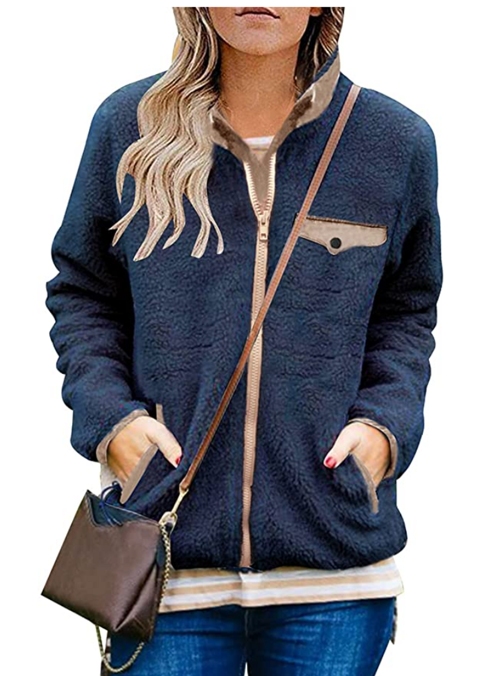 The next time you’re feeling a chill, just throw this sherpa jacket on top of whatever you’re wearing. It’s large enough that it’ll fit comfortably over layered clothes, and the zipper front even lets you catch the breeze if you start to feel too warm. Plus, you’ve gotta admit — that chest pocket flap is pretty cute.
