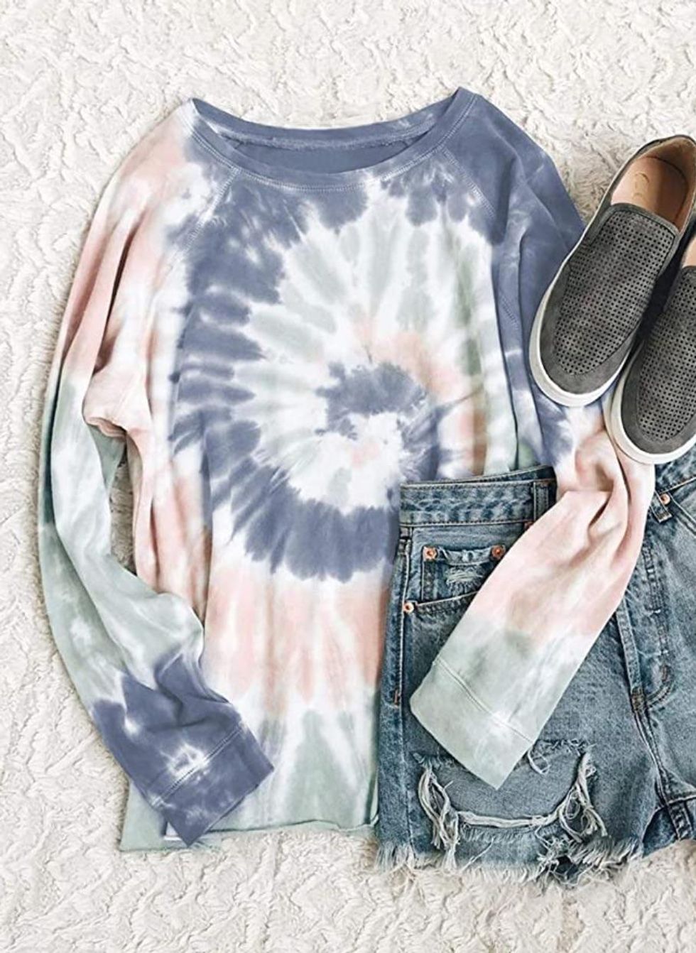 Customers say this cute Tie Dye Sweatshirt is like a cross between a t-shirt and a sweatshirt: lightweight and super-soft. Though it fits true to size, order up a size and half-tuck it to look on-trend. Looks fantastic with denim shorts!