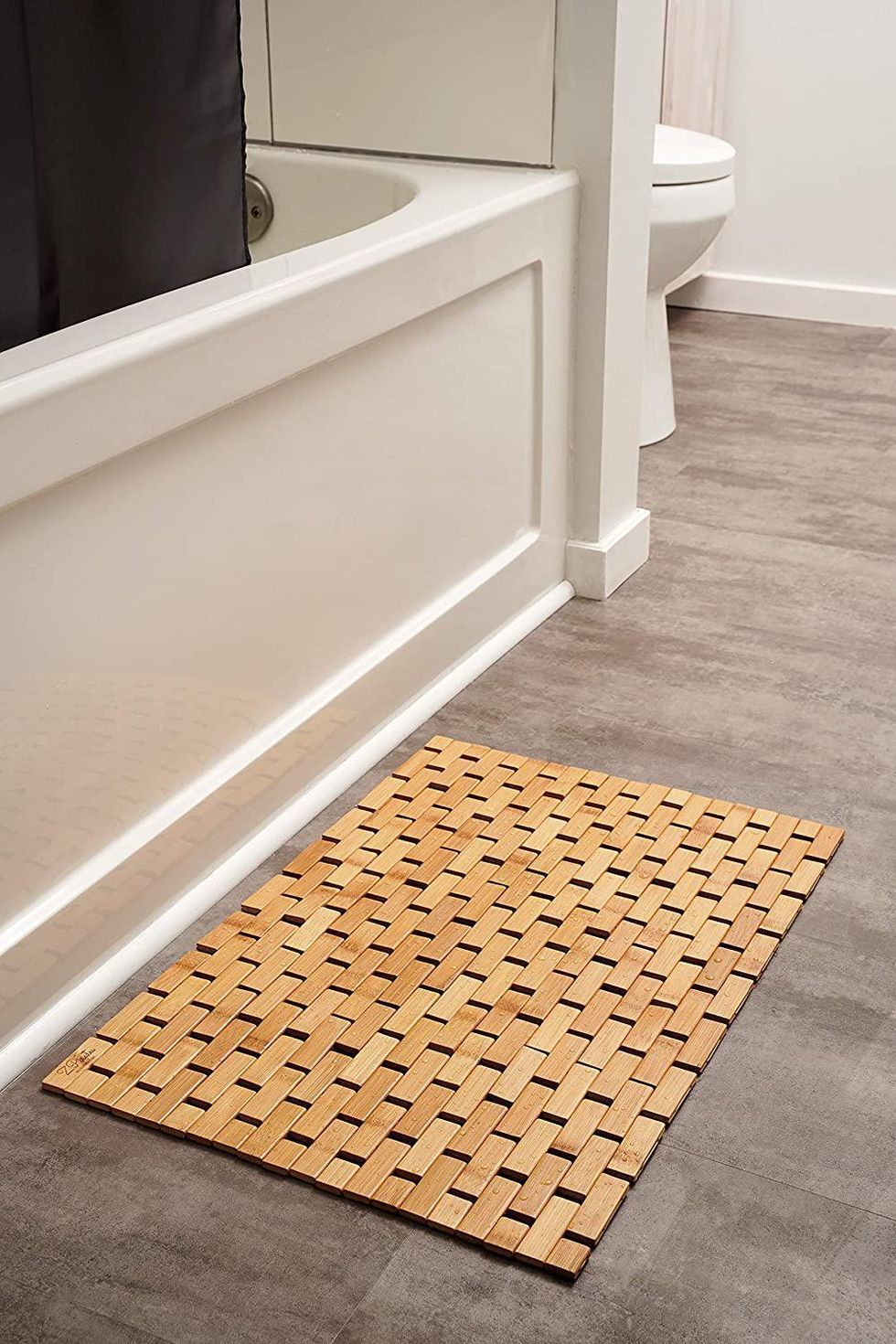 I’ve never had bamboo bath mats, but I’m not opposed to it. I especially like the clean lines and streamlined profile of this one, made of natural bamboo with floor-gripping rubber pads on the bottom. This bamboo mat comes in standard and extra-large sizes and helps keep your wet feet off the floor or moisture from seeping into more traditional bath rugs.