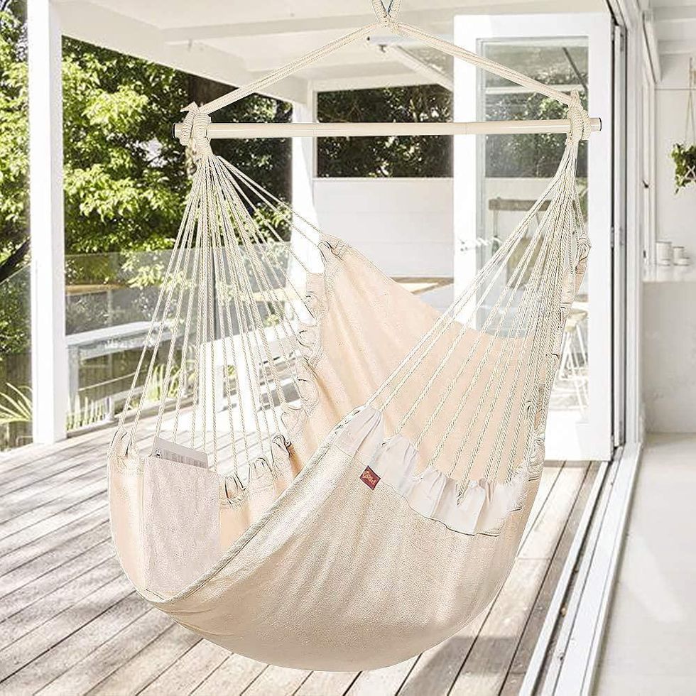 Hammock? Check. Swinging chair? Check. This two-in-one hammock chair does it all, offering a relaxed place to sit that’s easier to get in and out of than your typical hammock, but with all its signature comfort. It can be used both indoors and out, accommodating up to 380 pounds. This version also has a side pocket, which is perfect for stashing your Kindle or phone when the urge to nap hits.