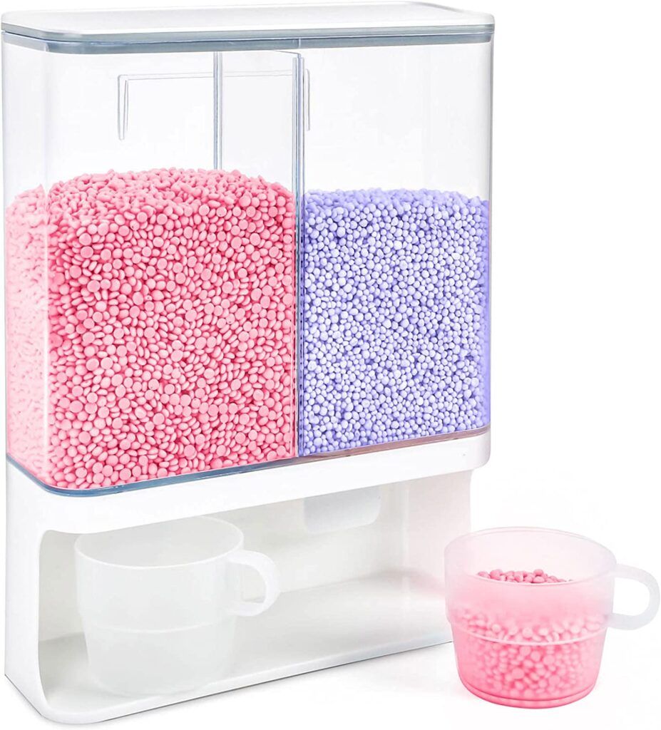 “I’m one of those women that bought this for the TikTok videos I’ve seen using it for laundry beads. I’ve filled this thing to the brim with scent beads on one side, Oxiclean on the other, and we set drier sheets on top of it. The only thing holding it to our wall (unfinished drywall in the basement) is the suction thing that was included, and that thing is STURDY! I was hesitant at first to fill it up, so I inched up the fills after a few days until it was full and we use it almost daily. No slipping!”