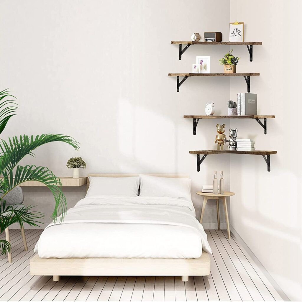 Reviews say, “We were pleasantly surprised when these shelves arrived. The shelves themselves are lightweight, and the brackets are very sturdy and come with extra screws. They were fabricated evenly, so by nature of them being corner shelves, they didn’t even require a level to install. On top of all of that, they’re very attractive shelves. All in all, I gave them 5 stars for price, quality, ease of installation, and aesthetics.”