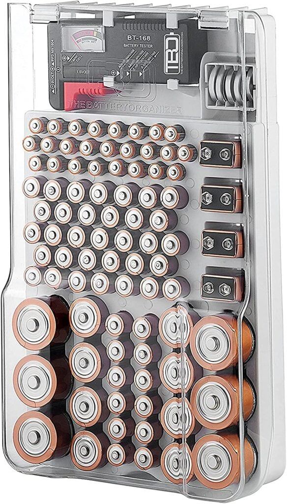 Reviews say, “Well designed and sturdy product. It solves the problem of searching for batteries when you need them. I see myself buying less batteries as now, all my batteries are neatly stored in one central location. The tester is a great feature, it takes the guess work out of what is normally a very tedious chore of find[ing] the right battery, making sure it’s a good battery, and determining if the problem lies with the battery or the actual device. would highly recommend this to anyone seeking to organize their battery supply”