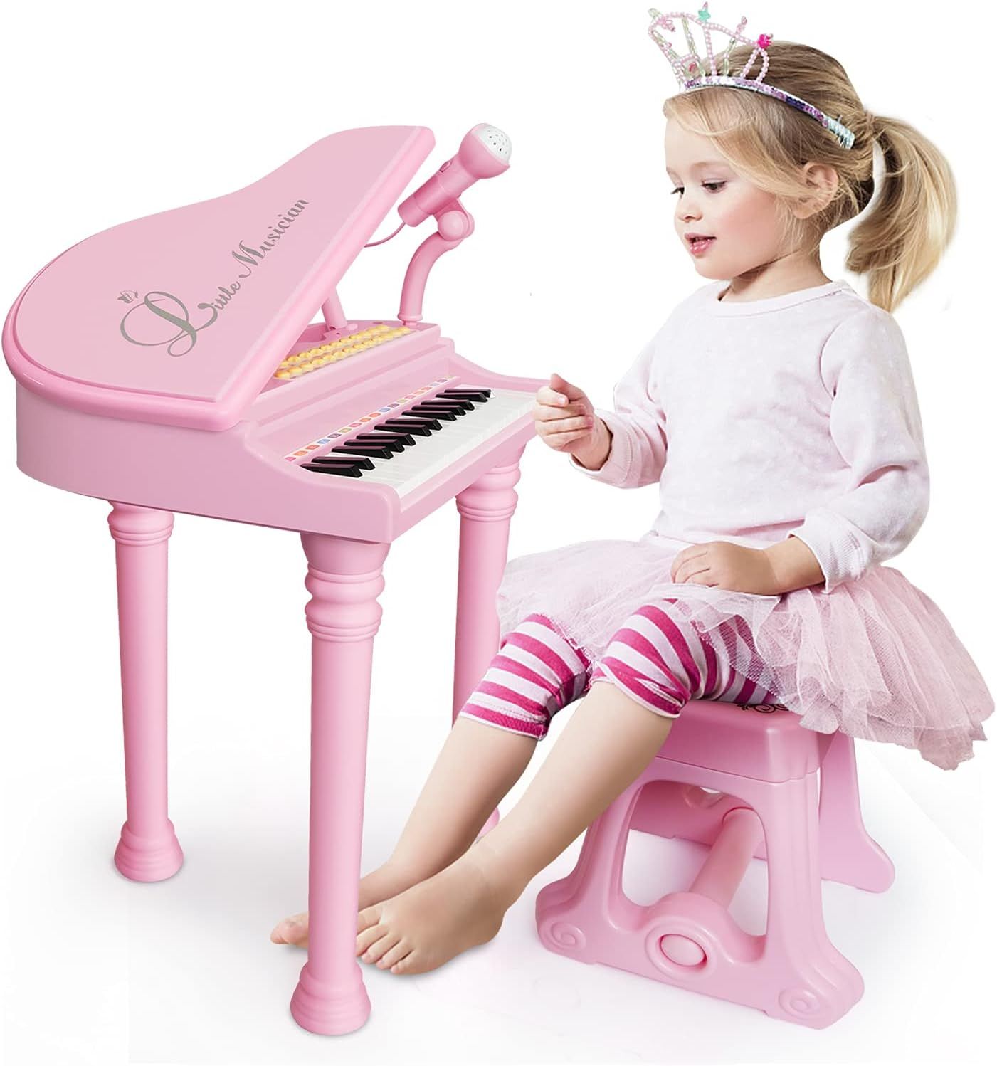 Unleash the maestro within! This piano’s pitch-perfect magic nurtures early musical talent. With 31 keys and a microphone, the stage is set for melodic brilliance. Open the lid to adjust its style, height and your tiny virtuoso’s dreams. Perfect for toddlers, it’s an educational playground: 31 keys, eight percussion and four musical instruments, rhythms, demos, and more. From hearing skills to coordination, let the music spark a symphony of growth.