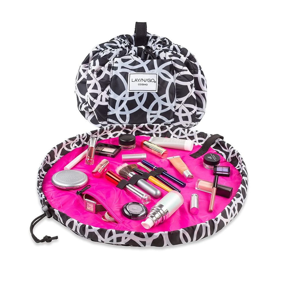 I like this one for a number of reasons. For starters, you can easily lay out this drawstring makeup bag to see everything you need all at one time. When it’s time to leave, simply pull the bag closed, and you can transport all your brushes, compacts, and bottles with you. Plus it’s compact enough that you’ll barely take up any room in your suitcase.